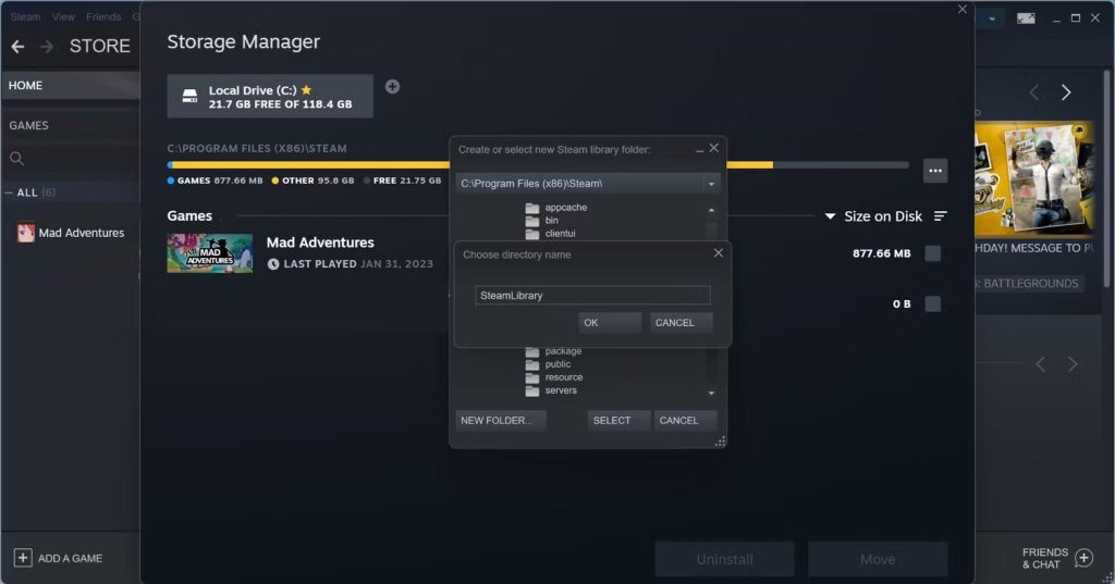 Βήμα 4:Για να μετακινήσετε τα παιχνίδια ατμού, κάντε κλικ στοπροσθέτωσύμβολο, επιλέξτε τη μονάδα δίσκου και στη συνέχεια δημιουργήστε έναΦάκελος ατμούσε αυτή τη μονάδα.