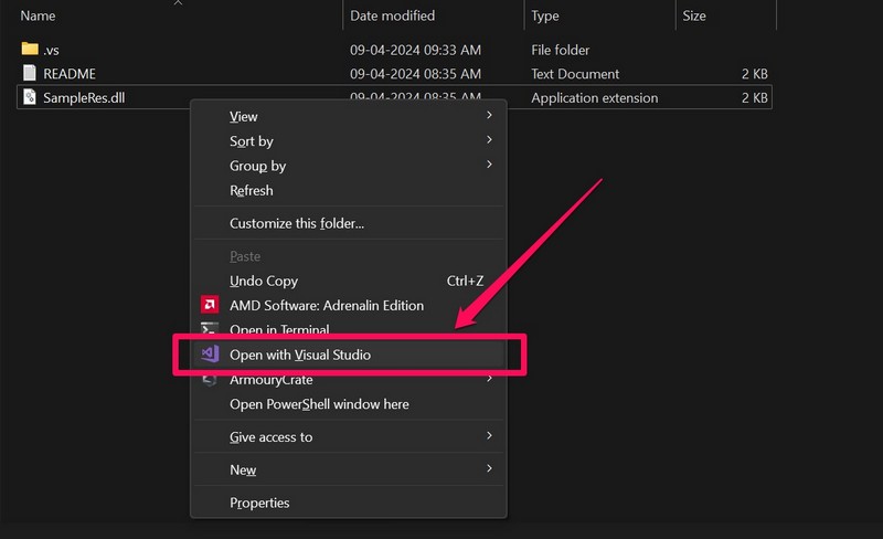2. Κάντε δεξί κλικ στο αρχείο DLLκαι επιλέξτε τοΑνοίξτε με το Visual Studioεπιλογή από το μενού περιβάλλοντος.