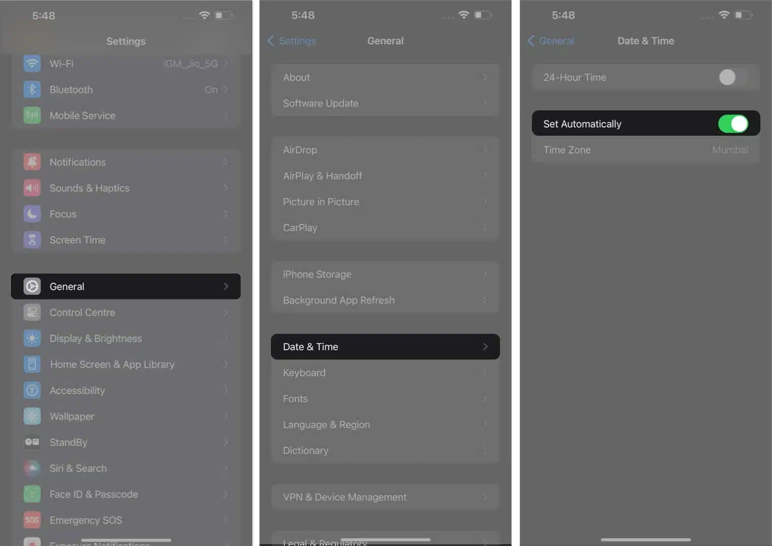 Μόλις επανεκκινηθεί το iPhone σας, ελέγξτε αν εμφανίζει τη σωστή ημερομηνία και ώρα. Εάν όχι, οι συναγερμοί σας δεν θα σβήσουν την αναμενόμενη ώρα. Για να το διασφαλίσετε, μεταβείτε στοΡυθμίσεις→Γενικός→ Ημερομηνία & ώρα εναλλαγήΟρίστε αυτόματα→ Επιλέξτε το δικό σαςΖώνη ώρας.
