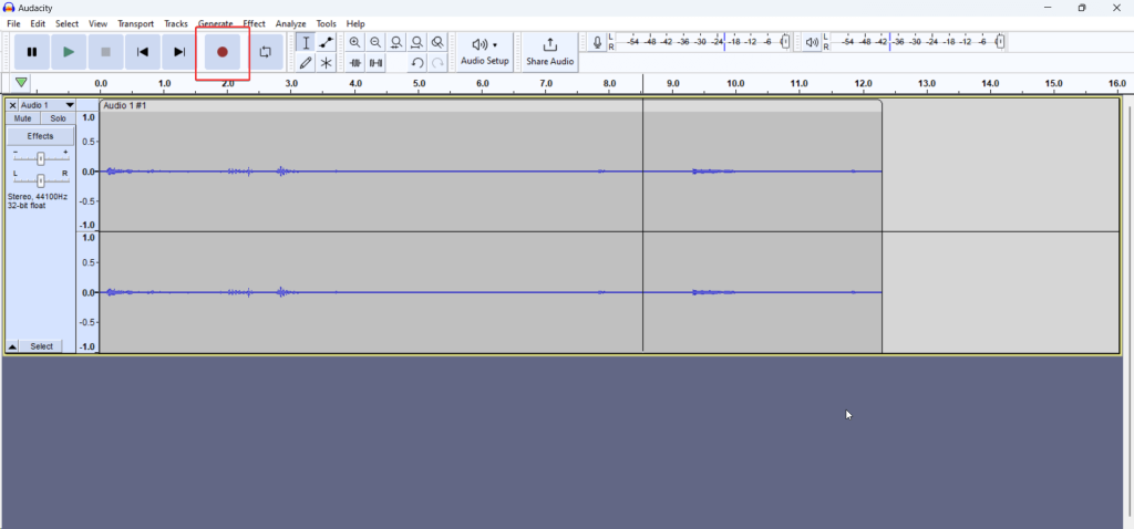 Βήμα 4 -Κάντε κλικ στοΡεκόρκουμπί και παίξτε το βίντεο YouTube. Όταν η εγγραφή βρίσκεται σε εξέλιξη, θα δείτε τις ηχητικές ράβδους να εμφανίζονται στην οθόνη Audacity.