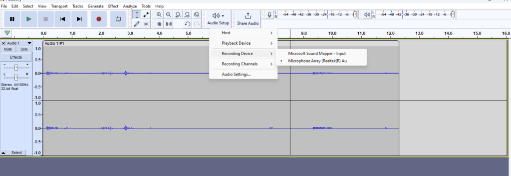 Βήμα 3 -Στο Audacity, κάντε κλικ στο κουμπίΡύθμιση ήχουκουμπί και επιλέξτεΣυσκευή αναπαραγωγής, συσκευή εγγραφήςκαιΚανάλια εγγραφής.