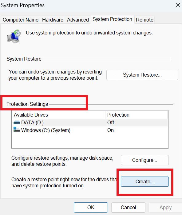 - Κάντε κλικ στοΔημιουργώκουμπί κάτω από τοΡυθμίσεις προστασίας