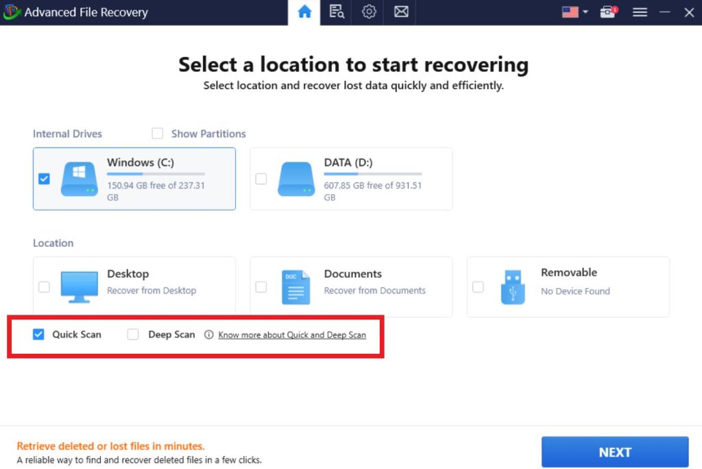 - Μόλις βρίσκεστε στην αρχική οθόνη, απλά επιλέξτε την τοποθεσία όπου τα χαμένα αρχεία σας είχαν αρχικά αποθηκευτεί. Από εκεί, μπορείτε να επιλέξετε είτε τοΓρήγορη σάρωση ή βαθιά λειτουργία σάρωσης.Αφού κάνετε την επιλογή σας, προχωρήστε κάνοντας κλικ στο επόμενο κουμπί.