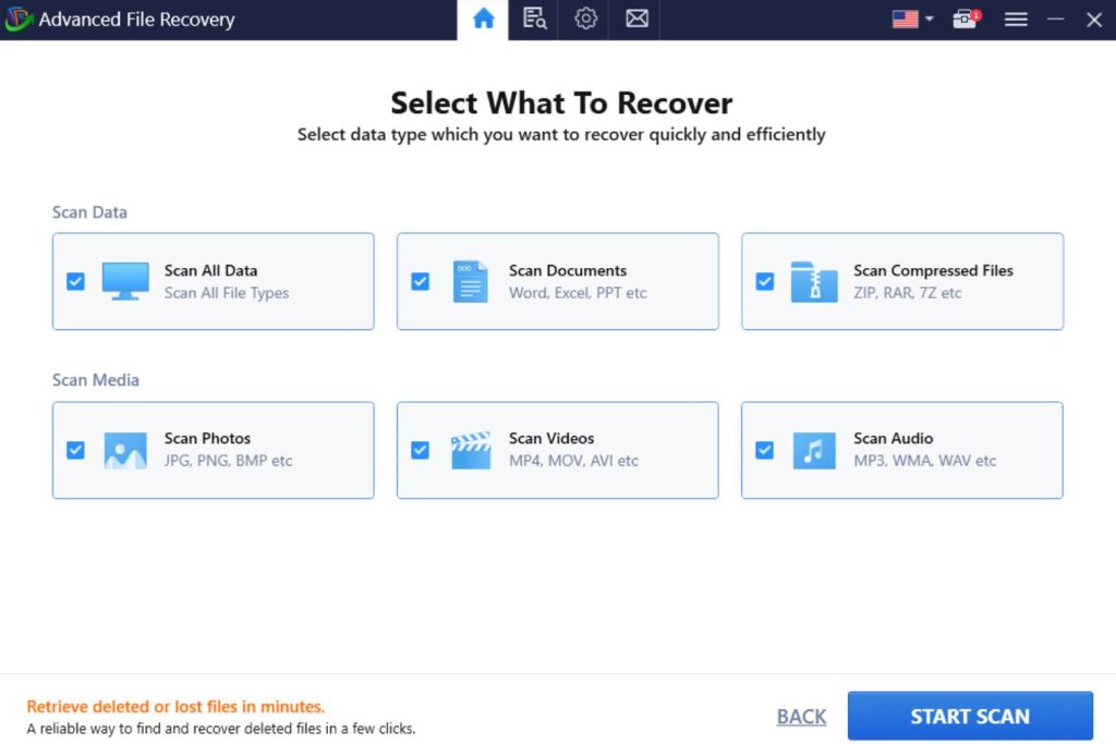 - Μέσα σε αυτήν την ενότητα, θα βρείτε μια σειρά τύπων δεδομένων σάρωσης συμπεριλαμβανομένωνΣάρωση όλων των δεδομένων, σάρωσης εγγράφων, σάρωσης συμπιεσμένων αρχείων, σάρωσης φωτογραφιών, σάρωσης βίντεο και ήχου σάρωσης.Μη διστάσετε να επιλέξετε οποιαδήποτε από αυτές τις επιλογές με βάση τις συγκεκριμένες ανάγκες σας. Μόλις φτιάξετε την επιλογή σας, απλά κάντε κλικ στοΞεκινήστε τη σάρωσηκουμπί για να ξεκινήσετε την αναζήτηση για τα χαμένα αρχεία.