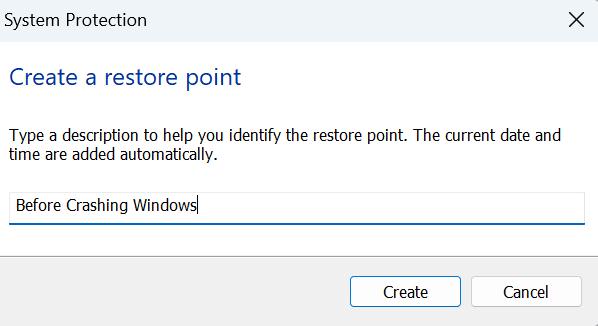 - Δώστε στο σημείο επαναφοράς ένα όνομα που είναι κατάλληλο. Σε αυτή την περίπτωση,Πριν συντρίψετε τα Windowsκαι πατήστεΔημιουργώ