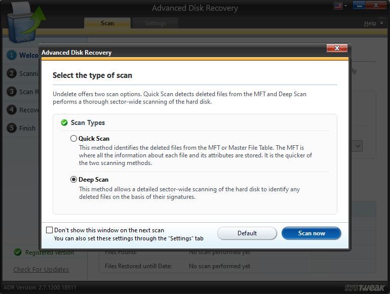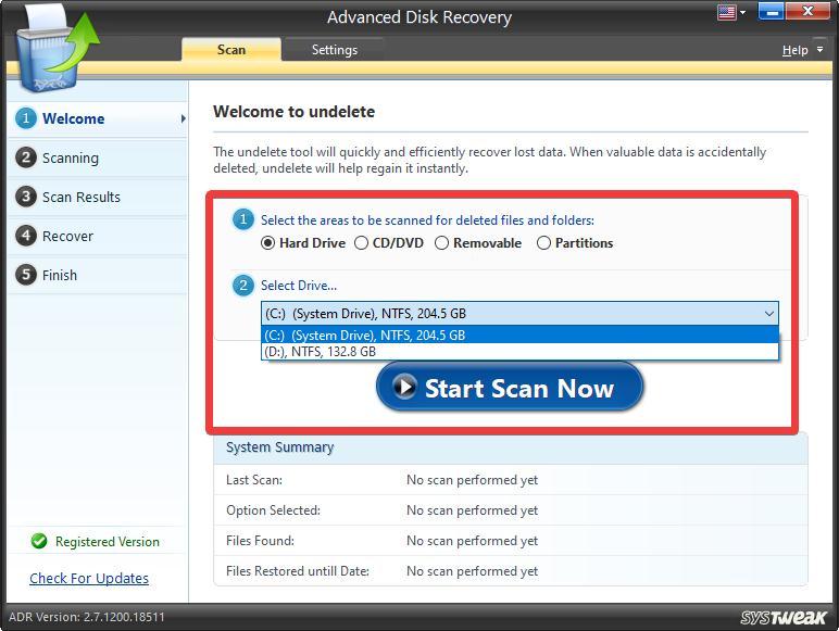 Το δημοφιλές πρόγραμμα αποκατάστασης δεδομένων Advanced Disk Recovery, που αναπτύχθηκε από το λογισμικό Systweak, έχει σχεδιαστεί με ποικίλα χαρακτηριστικά αιχμής, όπως η ικανότητα ανάκτησης δεδομένων από χαμένα διαμερίσματα, υποστήριξη για πολυάριθμες μορφές αρχείων και εξωτερικά μέσα αποθήκευσης. Εάν δεν μπορείτε να ανακτήσετε όλα τα αρχεία χρησιμοποιώντας το λογισμικό ανάκτησης Lexar τότε θα πρέπει να επιλέξετε την προηγμένη ανάκτηση δίσκου.
