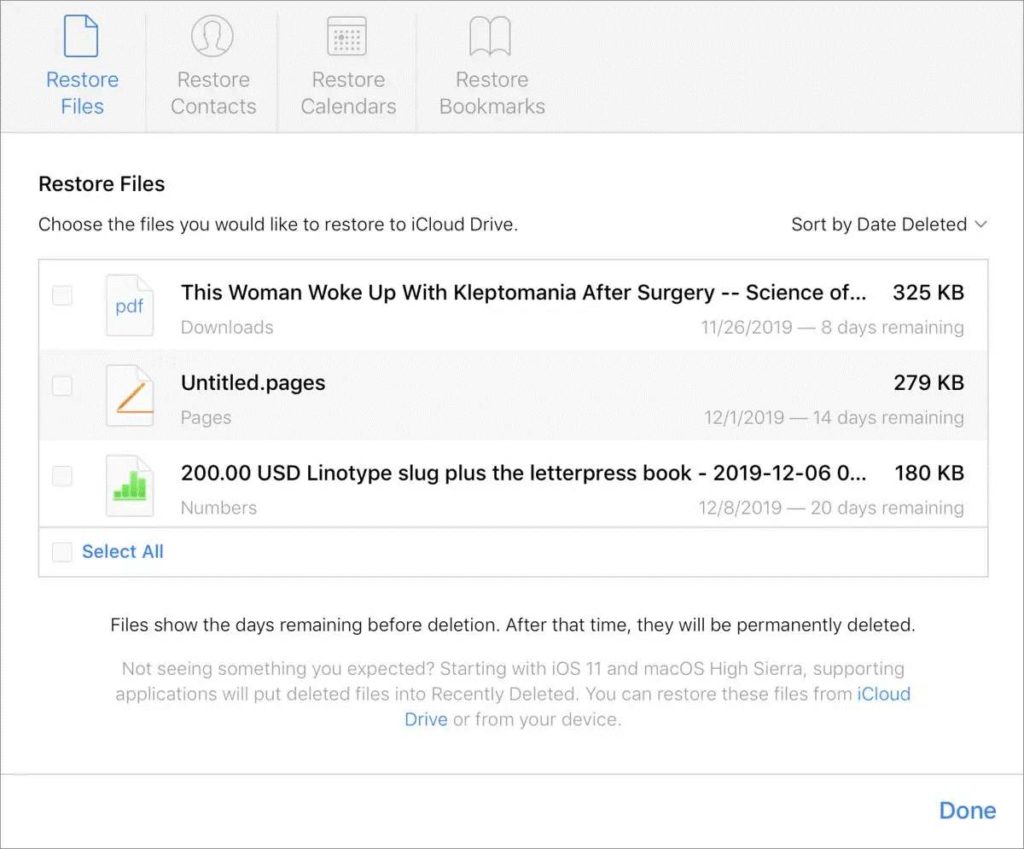 Θυμηθείτε στην αρχή του άρθρου που σας είπα ότι υπάρχει μια μικρή αλίευση στην ανάκτηση διαγραμμένων αρχείων από το iCloud; Και αυτό είναι"Μπορείτε γρήγορα να ανακτήσετε διαγραμμένα αρχεία από το iCloud εντός 30 ημερών. Δεν μπορείτε να επαναφέρετε αυτά τα αρχεία μετά την περίοδο χάριτος των 30 ημερών. Επιπλέον, εάν τα δεδομένα στο iCloud καταστράφηκαν πλήρως, δεν μπορούν να ανακτηθούν στις συσκευές σας".
