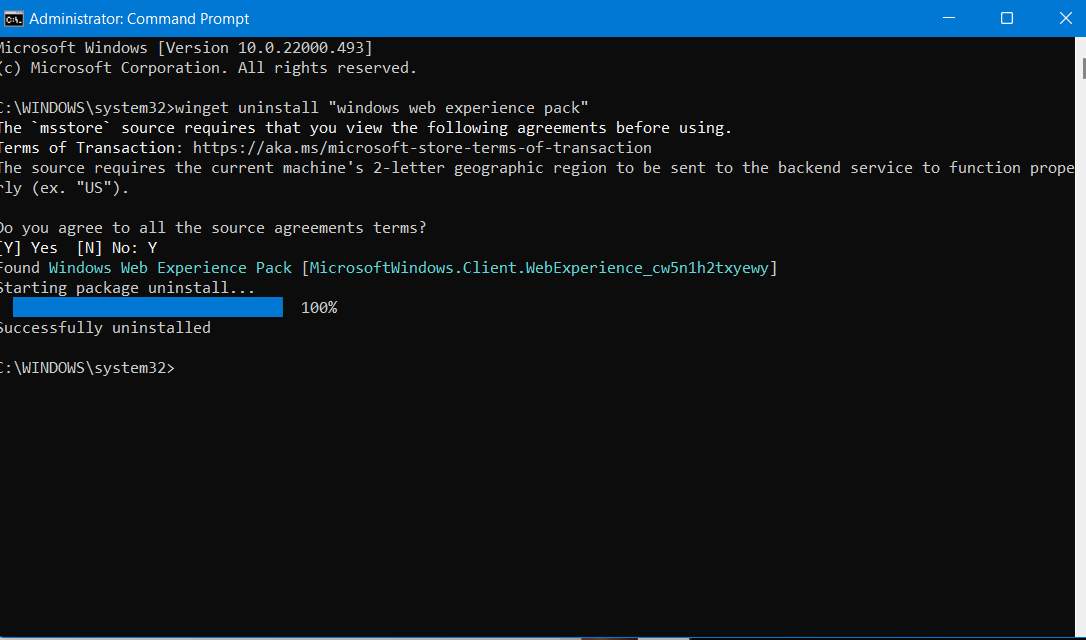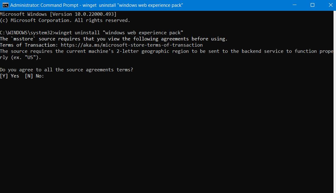 3.Μετά από αυτό, θα λάβετε ένα μήνυμα που ρωτάει: "Συμφωνείτε με όλους τους όρους συμφωνίας πηγής;" Τώρα, κάντε κλικ στοYκλειδί στο πληκτρολόγιό σας και χτυπήστεΕισάγωΓια να απεγκαταστήσετε το πακέτο Windows Web Experience, συμπεριλαμβανομένης της λειτουργίας widgets.