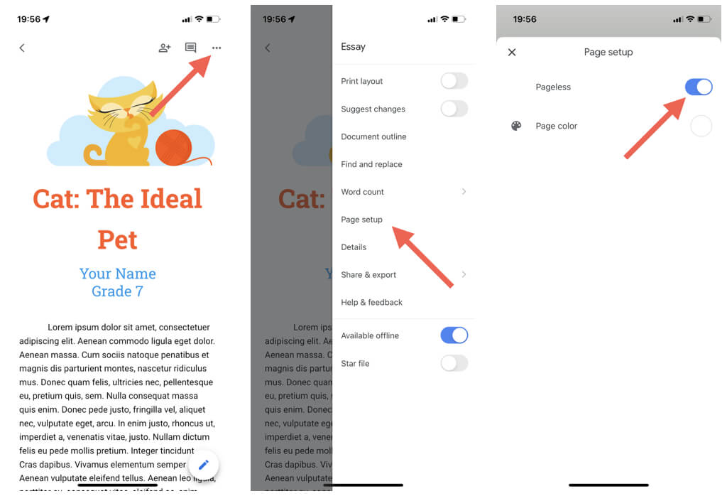 Εάν θέλετε να διαβάσετε τα περιεχόμενα ενός εγγράφου Google Docs χωρίς χειροκίνητοήΑυτόματη σελίδα σπάει τη διακοπή της ροής, δοκιμάστε να αλλάξετε τη ρύθμιση της σελίδας στη μορφή χωρίς pag. Να γίνει αυτό: