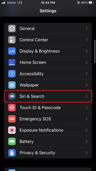 - Στο μενού Ρυθμίσεις, μετακινηθείτε προς τα κάτω και αναζητήστε τοSiri & Searchεπιλογή. Πατήστε σε αυτό για να αποκτήσετε πρόσβαση στις ρυθμίσεις Siri και αναζήτησης.