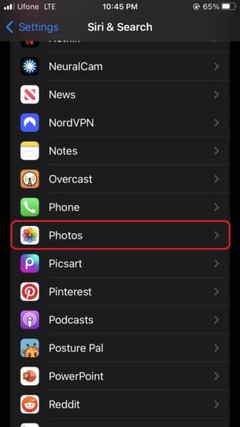 - Μέσα στοSiri & SearchΡυθμίσεις, μετακινηθείτε προς τα κάτω μέχρι να βρείτε τοΦωτογραφίεςεπιλογή. Πατήστε σε αυτό για να εισαγάγετε τις ρυθμίσεις των φωτογραφιών.
