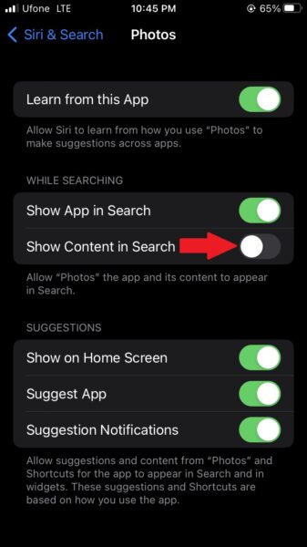 - Εάν θέλετε να αποτρέψετε όλες τις φωτογραφίες και την ίδια την εφαρμογή φωτογραφιών να εμφανιστεί στο Spotlight Search Affser, εναλλαγή από τοΕμφάνιση εφαρμογής στην αναζήτησηεπιλογή. Αυτό θα αποκλείσει πλήρως τις φωτογραφίες από τα αποτελέσματα αναζήτησης. Εάν εξακολουθείτε να θέλετε να εμφανιστεί η εφαρμογή φωτογραφιών στα αποτελέσματα αναζήτησης, αλλά δεν θέλετε να εμφανίζονται μεμονωμένες φωτογραφίες σε αναζητήσεις στο Spotlight, αλλάξτε το από τοΕμφάνιση περιεχομένου στην αναζήτησηεπιλογή. Με αυτόν τον τρόπο, μόνο η εφαρμογή θα είναι ορατή στα αποτελέσματα αναζήτησης.