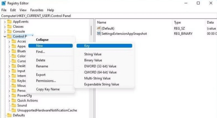 Βήμα 1:Κάντε δεξί κλικ HKEY_CURRENT_USERCONTROL PANEL, το πλήκτρο ελέγχου, στον επεξεργαστή μητρώου, και επιλέξτε νέο> κλειδί.