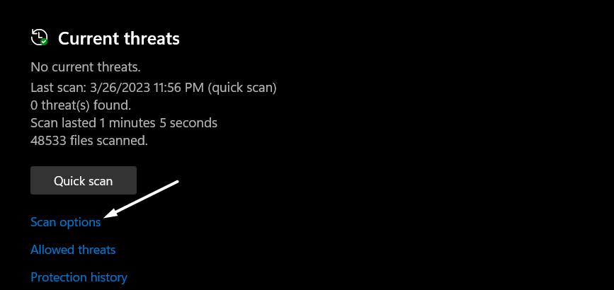 2.ΕπιλέγωΠροστασία ιών και απειλώναπό τοΚαλύτερος αγώναςΤμήμα και κάντε κλικ στοΕπιλογές σάρωσηςυπόΤρέχουσες απειλές.