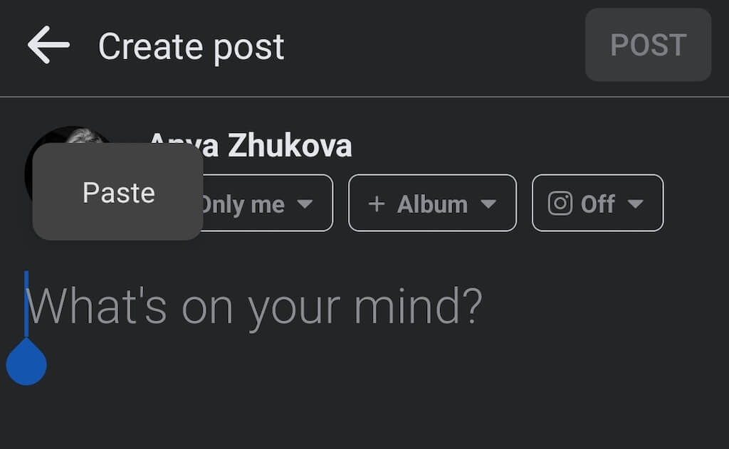 - Δημιουργήστε μια νέα ανάρτηση στο Facebook. Τότε πατήστε και κρατήστε κρατήστε μέχρι την επιλογήΠάσταεμφανίζεται.