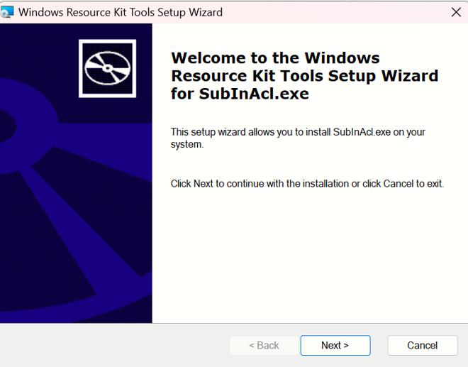 Ο ιστότοπος της Microsoft προσφέρει το βοηθητικό πρόγραμμα SUBINACL για λήψη. Η λήψη ξεκινά αμέσως όταν φορτώνετε τον ιστότοπο. Εάν όχι, κάντε κλικ στο σύνδεσμο μετά από καθυστέρηση 30 δευτερολέπτων για να το κατεβάσετε με μη αυτόματο τρόπο. Κάντε διπλό κλικ στο πακέτο εγκατάστασης μετά την λήψη του. Ο οδηγός εγκατάστασης θα ξεκινήσει ως αποτέλεσμα. Μπορείτε να χρησιμοποιήσετε το εργαλείο SUBINACL εάν δεν είστε άνετοι χρησιμοποιώντας τη γραμμή εντολών. Η Microsoft παρέχει ένα εργαλείο γραμμής εντολών που μπορεί να χρησιμοποιηθεί για την επαναφορά των δικαιωμάτων χρήστη. Έτσι το κάνετε:
