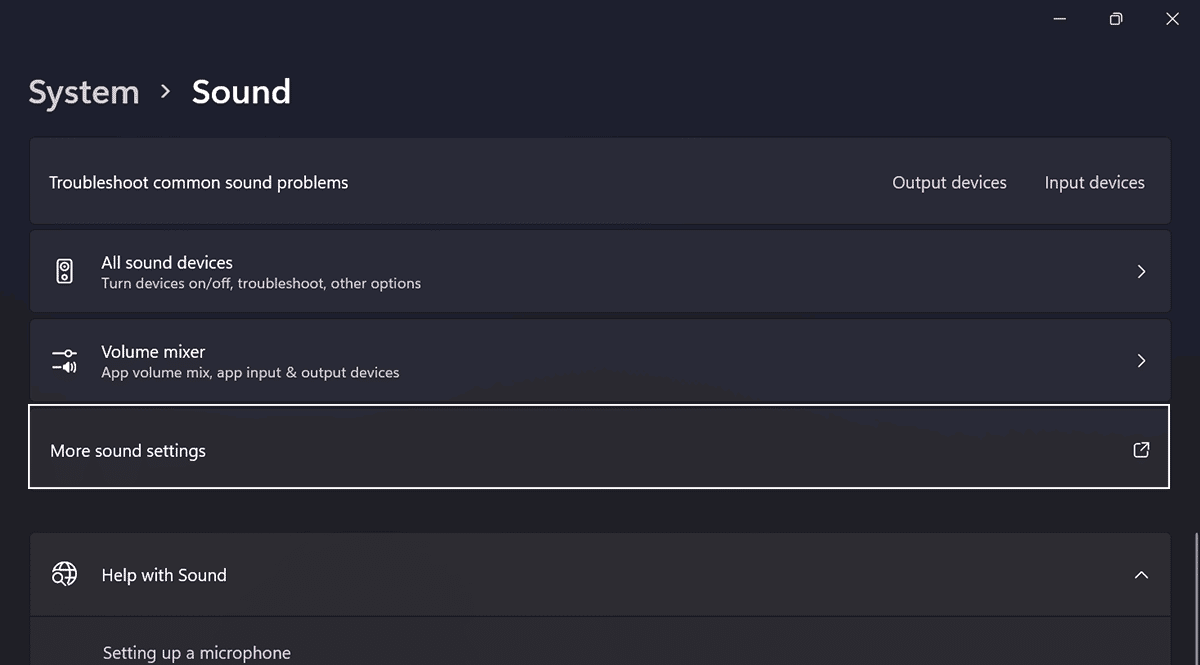 - Ανοίξτε τις Ρυθμίσεις> Κάντε κλικ στοΣύστημαΚάντε κλικ στοΉχοςκαρτέλα> κάτω από την ενότητα "Advanced"> κάντε κλικ στοΠερισσότερες ρυθμίσεις ήχουεπιλογή.