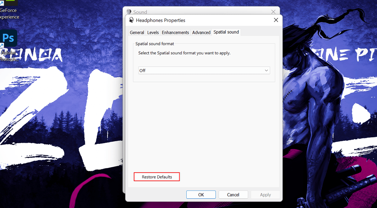 - Κάντε κλικ στοΔιαστημικόςΚαρτέλα ήχου> Κάντε κλικ στοΕπαναφορά προεπιλογώνκουμπί.