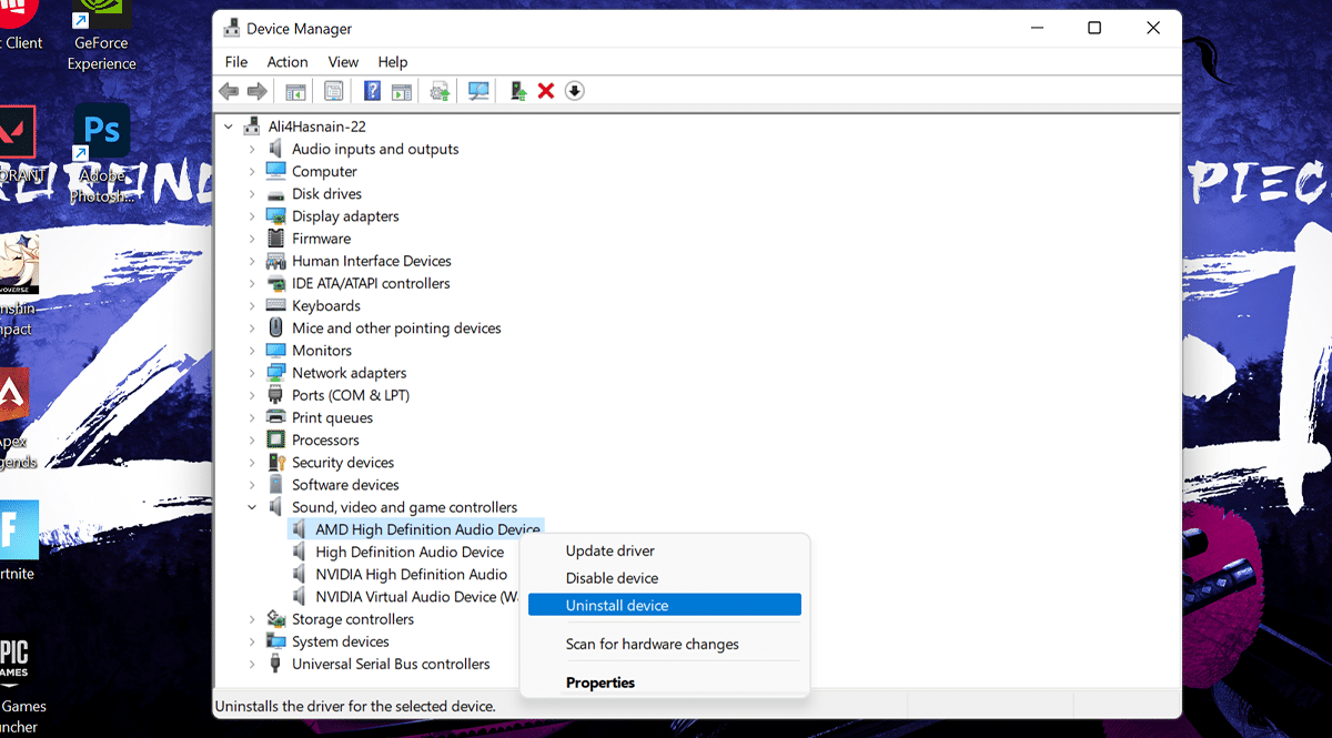 - Επεκτείνω τοΕλεγκτές ήχου, βίντεο και παιχνιδιώνΚατηγορία> Κάντε δεξί κλικ στον προσαρμογέα ήχου> Επιλέξτε την επιλογή Uninstall Device.