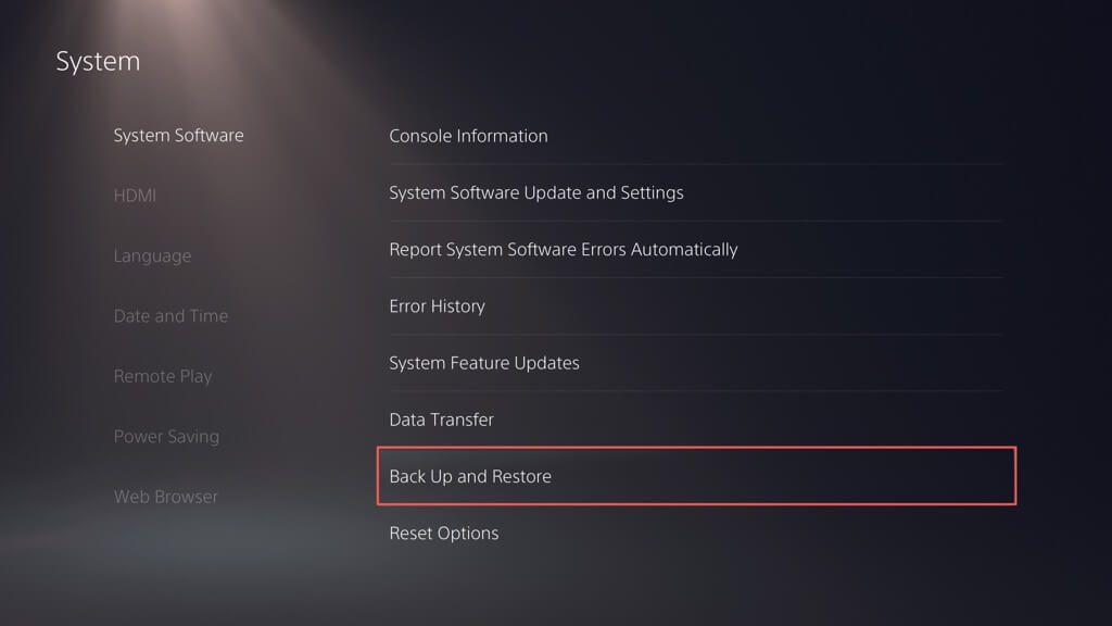 Για να επαναφέρετε δεδομένα από ένα εξωτερικό αντίγραφο ασφαλείας, μεταβείτε στοΡυθμίσεις>Σύστημα>Λογισμικό συστήματος>Δημιουργία αντιγράφων ασφαλείας και επαναφορά, και επιλέξτεΕπαναφέρωΤο PS5 σας.