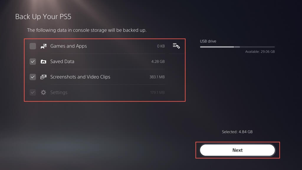 Χρειάζεστε έναν εξωτερικό σκληρό δίσκο EXFAT/FAT32 για να δημιουργήσετε αντίγραφα ασφαλείας του PS5 σας και θα πρέπει να έχει την ικανότητα να ταιριάζει στα δεδομένα σας. Ωστόσο, μπορείτε να χρησιμοποιήσετε μια μονάδα flash μικρότερου μεγέθους και να αποκλείσετε εφαρμογές και παιχνίδια από το αντίγραφο ασφαλείας.