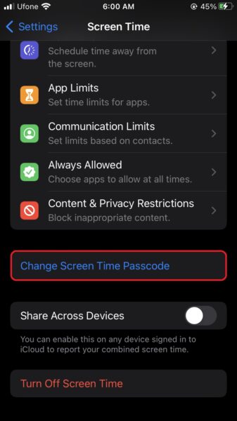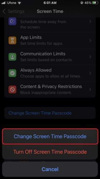 - Μετακινηθείτε προς τα κάτω και πατήστεΑλλάξτε τον κωδικό πρόσβασης χρόνου οθόνης.