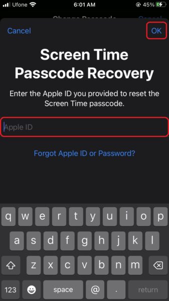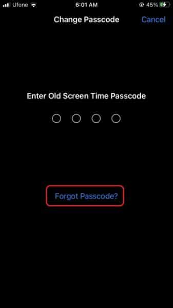 - Το iPhone σας θα σας ζητήσει τώραΕισαγάγετε τον παλιό κωδικό πρόσβασης χρόνου οθόνης.ΠαρακέντησηΞεχάσατε τον κωδικό πρόσβασης;για να το επαναφέρετε.