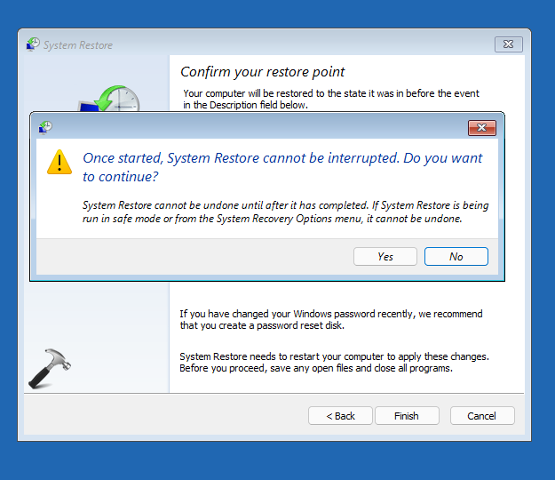 Σημείωμα:Πριν κάνετε κλικ Ναι, βεβαιωθείτε ότι έχετε συστάσεις αρκετή μπαταρία ή είναι συνδεδεμένο σε μια πηγή ενέργειας. Μόλις κάνετε κλικ στο Ναι, το σημείο επαναφοράς στο οποίο αποκαθιστάτε δεν θα είναι ξανά διαθέσιμο, εάν η επαναφορά του συστήματος διακόπτεται επί του παρόντος.