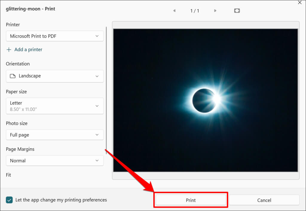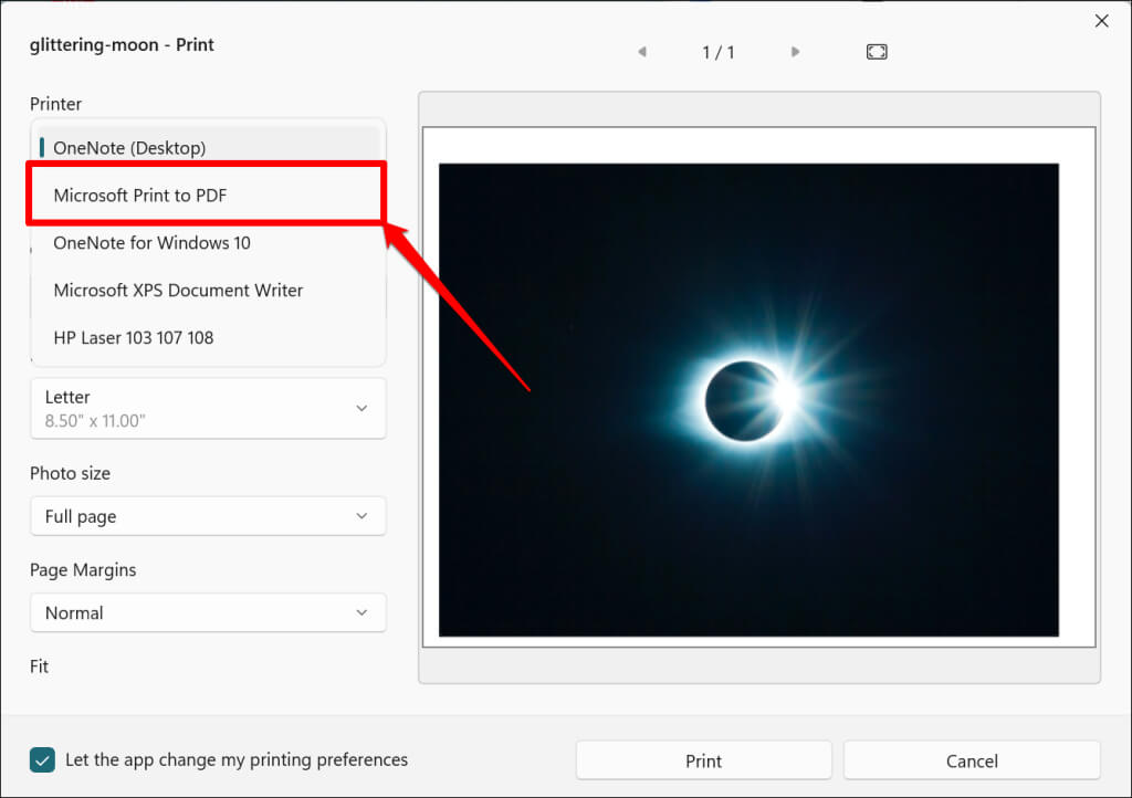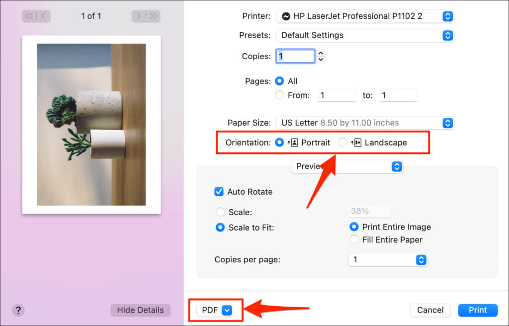 - Ρυθμίστε τον προσανατολισμό ή το μέγεθος του χαρτιού του προκύπτοντος PDF. Στη συνέχεια, επιλέξτεΑποτύπωμαΓια να δημιουργήσετε ένα έγγραφο PDF της αρχικής εικόνας.