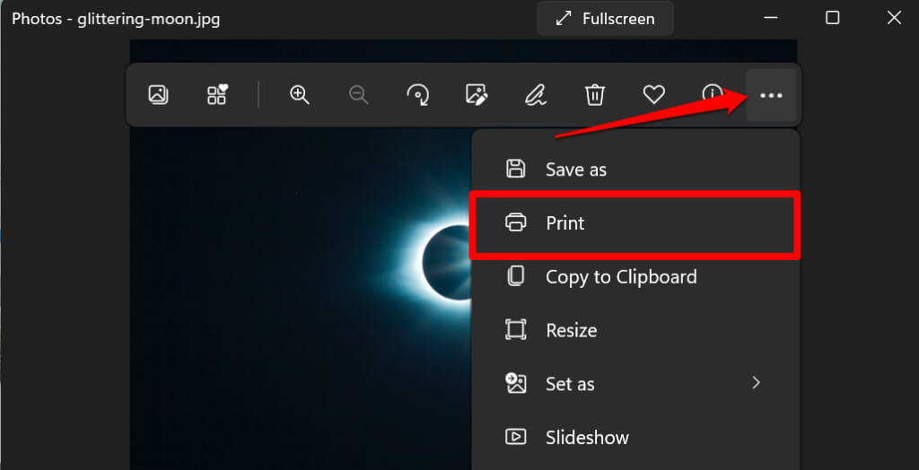 - ΤύποςCtrl+Π.Για να ανοίξετε το βοηθητικό πρόγραμμα εκτύπωσης των Windows. Εναλλακτικά, επιλέξτε τοεικονίδιο μενού τριών σημείωνστην επάνω δεξιά γωνία και επιλέξτεΑποτύπωμα.