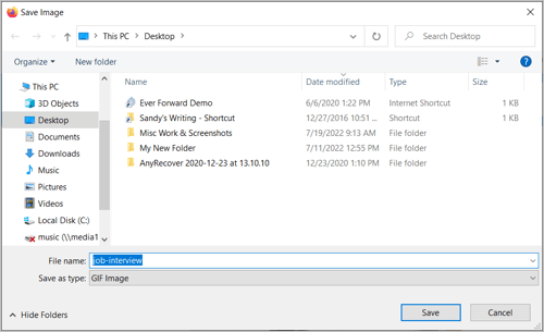 Όταν ανοίξει το παράθυρο διαλόγου αποθήκευσης ως διαλόγου, επιλέξτε μια τοποθεσία για να αποθηκεύσετε το GIF, προαιρετικά μετονομάστε το και επιβεβαιώστε τη μορφή αρχείου ως GIF. Θυμηθείτε, οι μορφές JPG και PNG δεν είναι κινούμενες εικόνες, αλλά στατικές.