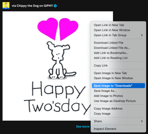 Μια άλλη επιλογή δεξί κλικ στο Mac είναιΑποθήκευση εικόνας σε λήψεις. Αυτό τοποθετεί το GIF απευθείας στο φάκελο λήψεων χωρίς να περάσετε από το βήμα διαλόγου Αποθήκευση ως παράθυρο διαλόγου παραπάνω.