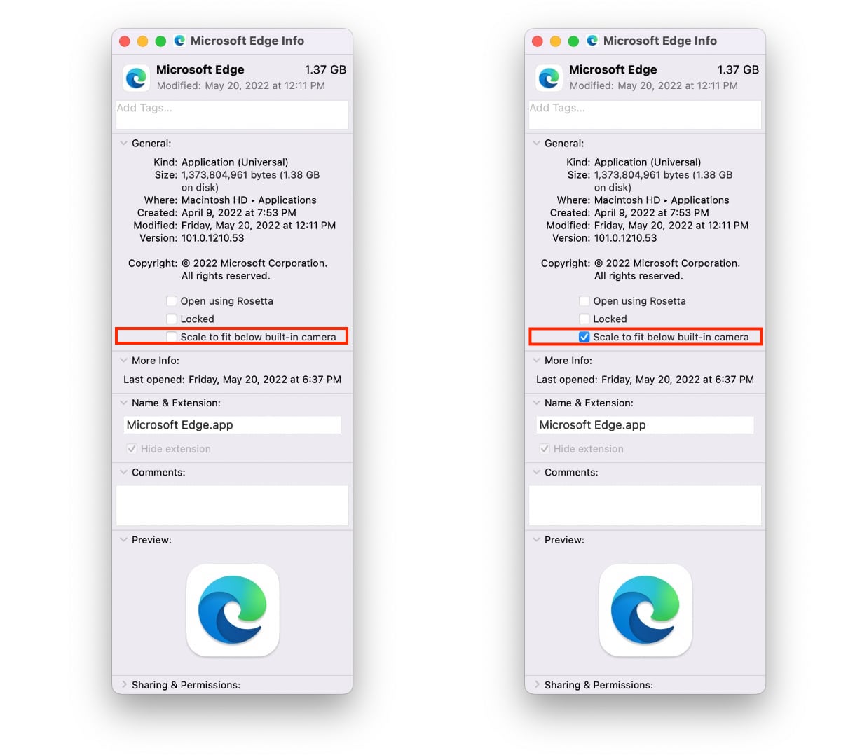 Για τέτοιες εφαρμογές, που δεν έχουν ενημερωθεί για τα νέα μοντέλα MacBook Pro, η Apple έχει αναπτύξει ένα χαρακτηριστικό που μπορεί να ενεργοποιηθεί σε βάση ανά εφαρμογή. Ονομάζεται "Κλίμακα που ταιριάζει κάτω από την ενσωματωμένη κάμερα", αυτή η λειτουργικότητα αναγκάζει τη γραμμή μενού και τα παράθυρα εφαρμογών να εμφανίζονται κάτω από την εγκοπή της κάμερας, η οποία μειώνει αποτελεσματικά τον κατακόρυφο χώρο εμφάνισης, αλλά εξασφαλίζει ότι η γραμμή μενού σας είναι ανεμπόδιστη από την εγκοπή.