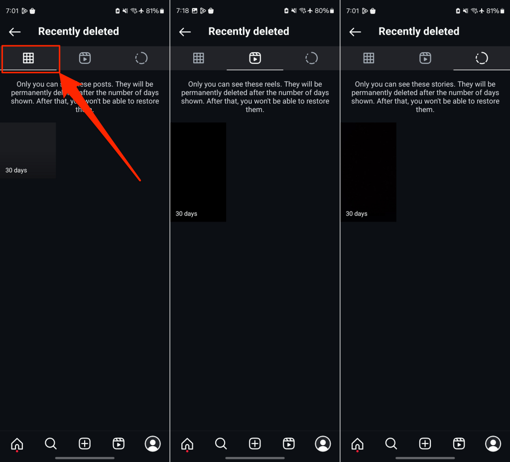 Οι πρόσφατα διαγραμμένες ομάδες φακέλων/σελίδων διαγράφηκαν κύλινδροι, ιστορίες και θέσεις σε ξεχωριστά τμήματα. Θα βρείτε τακτικές αναρτήσεις Instagram (φωτογραφίες και βίντεο) στην ενότητα Δημοσιεύσεις - με τοΕικονίδιο πλέγματος. Θα πρέπει να δείτε πόσο καιρό (σε ημέρες) πρέπει να αποκαταστήσετε την ανάρτηση πριν το Instagram το διαγράψει μόνιμα.