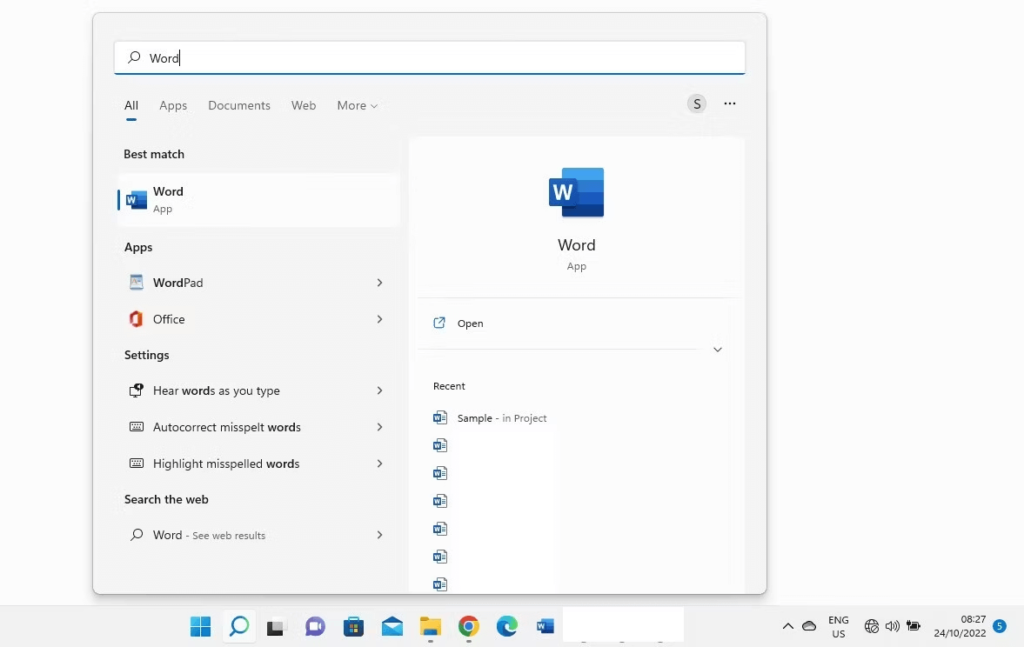 Βήμα 1:Μεταβληθώ σεΑναζήτηση παραθύρωνκαιΕισαγάγετε το όνομα της εφαρμογήςΓια να δείτε τα πρόσφατα ανοιχτά αρχεία για αυτήν την εφαρμογή. Μπορείτε να αποκτήσετε πρόσβαση σε όλα τα πρόσφατα ανοιχτά αντικείμενα σε αυτήν την εφαρμογή κάνοντας κλικ στο ίδιο στο δεξιό παράθυρο των αποτελεσμάτων αναζήτησης.