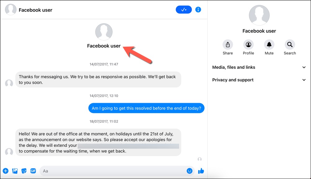 Είναι ευκολότερο να εντοπίσετε εάν έχετε μοιραστεί άμεσα μηνύματα με τον χρήστη στο παρελθόν. Στο Messenger, δεν θα χάσετε τα μηνύματα που έχετε μοιραστεί σε μια συνομιλία. Ακόμα, δεν θα μπορείτε να δείτε το προφίλ τους ή τις λεπτομέρειες, συμπεριλαμβανομένης της εικόνας του προφίλ τους ή οποιωνδήποτε κοινόχρηστων τοποθεσιών αγγελιοφόρων. Εάν αυτές οι λεπτομέρειες είναι κρυμμένες ή λείπουν, θα μπορούσε να σημαίνει ότι έχετε μπλοκαριστεί. Επίσης, δεν θα μπορείτε να στείλετε ξανά μηνύματα στον χρήστη.