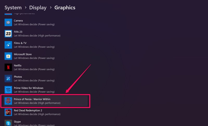 5. Εντοπίστε την εφαρμογή ή το πρόγραμμαγια την οποία θέλετε να ορίσετε μια προεπιλεγμένη κάρτα γραφικών στη λίστα εφαρμογών καιΚάντε κλικ σε αυτό. Για αυτή την επίδειξη, επιλέξαμε τον Πρίγκιπα της Περσίας: Πολεμιστής μέσα στο παιχνίδι (οθόνη παρακάτω).