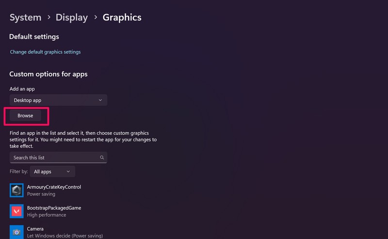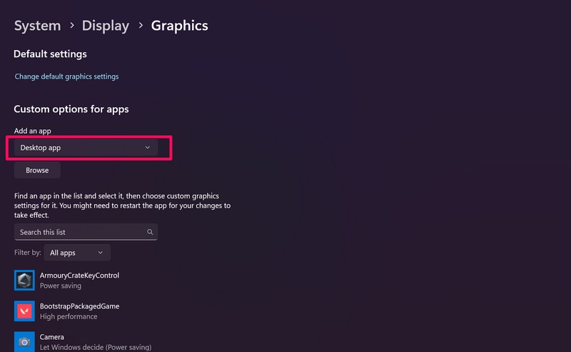10.Για να το κάνετε αυτό, πρώτα, κάντε κλικ στο πλαίσιο κάτω από τοΠροσθήκη εφαρμογήςΕνότητα στη σελίδα γραφικών στην εφαρμογή Ρυθμίσεις στη συσκευή σας Windows 11.