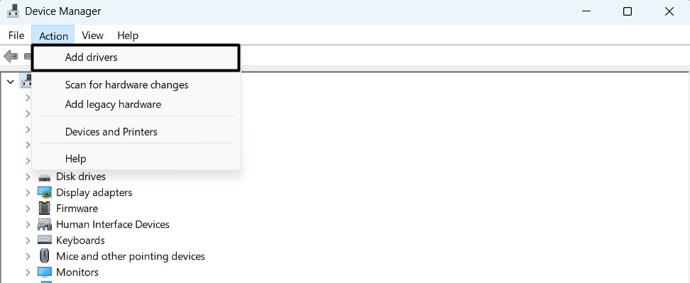 7.Μόλις τελειώσετε, ανοίξτεΔιαχειριστής συσκευώνστο υπολογιστή σας Windows 11 και κάντε κλικ στο κουμπίΔράσηΣτο επάνω μενού.