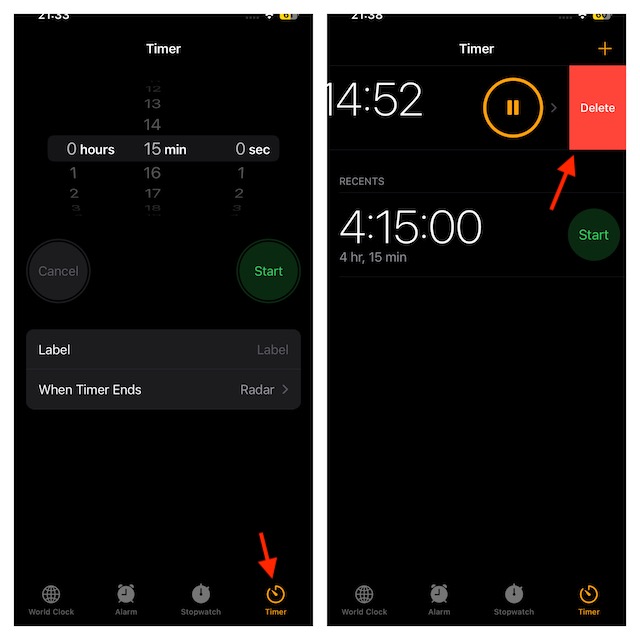 - Μπορείτε να αφαιρέσετε το χρονοδιακόπτη από την ενότητα Recents μεταφέροντας το από τα δεξιά προς τα αριστερά και στη συνέχεια πατώνταςΔιαγράφωστα δεξιά. Ο επιλεγμένος χρονοδιακόπτης θα διαγραφεί μόνιμα από την ενότητα Recents όταν αναλαμβάνετε αυτήν την ενέργεια.