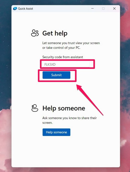 6.Ζητήστε από τον χρήστη στο τέλος λήψης να ξεκινήσει τοΓρήγορη βοήθειαεφαρμογή στον υπολογιστή ή το φορητό υπολογιστή τους καιΒάλτε τον μοναδικό κωδικό ασφαλείας στο πεδίο κειμένουκάτω από τοΛάβετε βοήθειαΤμήμα της εφαρμογής γρήγορης βοήθειας. Μετά από αυτό, ο δέκτης πρέπει να κάνει κλικ στοΥποτάσσομαικουμπί.
