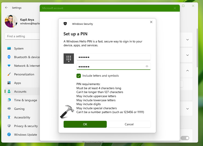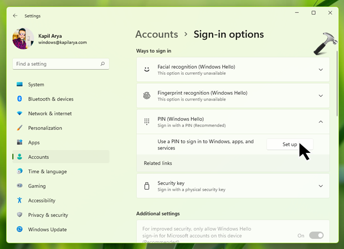 Εάν χρησιμοποιείτε λογαριασμό Microsoft, μπορείτε να χρησιμοποιήσετε αυτήν τη μέθοδο για να ρυθμίσετε το PIN στην οθόνη σύνδεσης. Αυτή η μέθοδος δεν θα λειτουργήσει για τοπικούς λογαριασμούς.