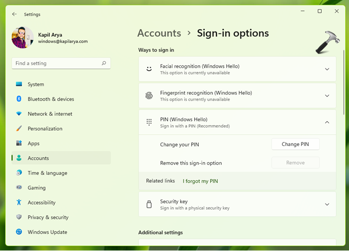 Στα Windows 11/10, τα Windows Hello είναι ένας πιο προσωπικός, πιο ασφαλής τρόπος για να αποκτήσετε άμεση πρόσβαση στη συσκευή σας Windows χρησιμοποιώντας ένα PIN, αναγνώριση προσώπου ή δακτυλικά αποτυπώματα. Θα χρειαστεί να ρυθμίσετε ένα PIN ως μέρος της ρύθμισης δακτυλικών αποτυπωμάτων ή αναγνώρισης προσώπου, αλλά μπορείτε επίσης να συνδεθείτε μόνο με το PIN σας. Μια καρφίτσα είναι αρκετά βολική επιλογή σύνδεσης στα Windows 11.Το PIN είναι συνήθως πιο ασφαλής σε σύγκριση με τον κωδικό πρόσβασης της παράδοσηςκαι πιο εύκολο στη χρήση. Σε αυτόν τον οδηγό, θα δούμε πώς να ρυθμίσετε το PIN στα Windows 11.