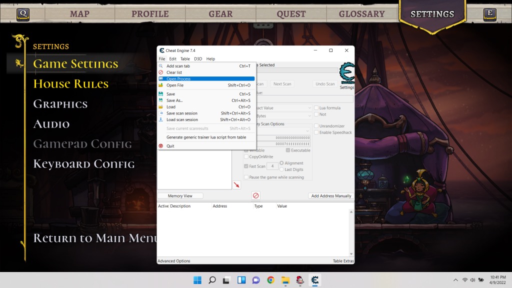 - Πρώτον, επιλέξτεΑρχείο>Ανοικτή διαδικασίαΓια να επιλέξετε τη διαδικασία παιχνιδιού με το Cheat Engine.