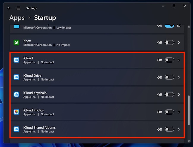 Ελαφρώς θαμμένο μέσα στις ρυθμίσεις των Windows υπάρχει μια επιλογή για τη διαχείριση των εφαρμογών που μπορούν να ξεκινήσουν κατά την εκκίνηση. Χρησιμοποιώντας αυτήν την ίδια τη μέθοδο, μπορείτε να τερματίσετε την αυτόματη εκκίνηση του Icloud. Εναλλακτικά, ο διαχειριστής εργασιών κάνει επίσης καλή δουλειά να επιτρέπει/απαγορεύει τις εφαρμογές/υπηρεσίες για να ανοίξει στην εκκίνηση των Windows 11.