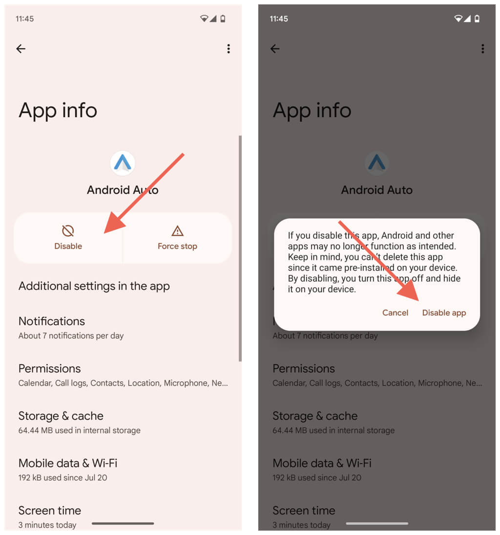 - ΠαρακέντησηAndroid Auto. Εάν υπάρχει μια επιλογή όπωςΚαθιστώ ανίκανοήΚλείνω, επιλέξτε το.