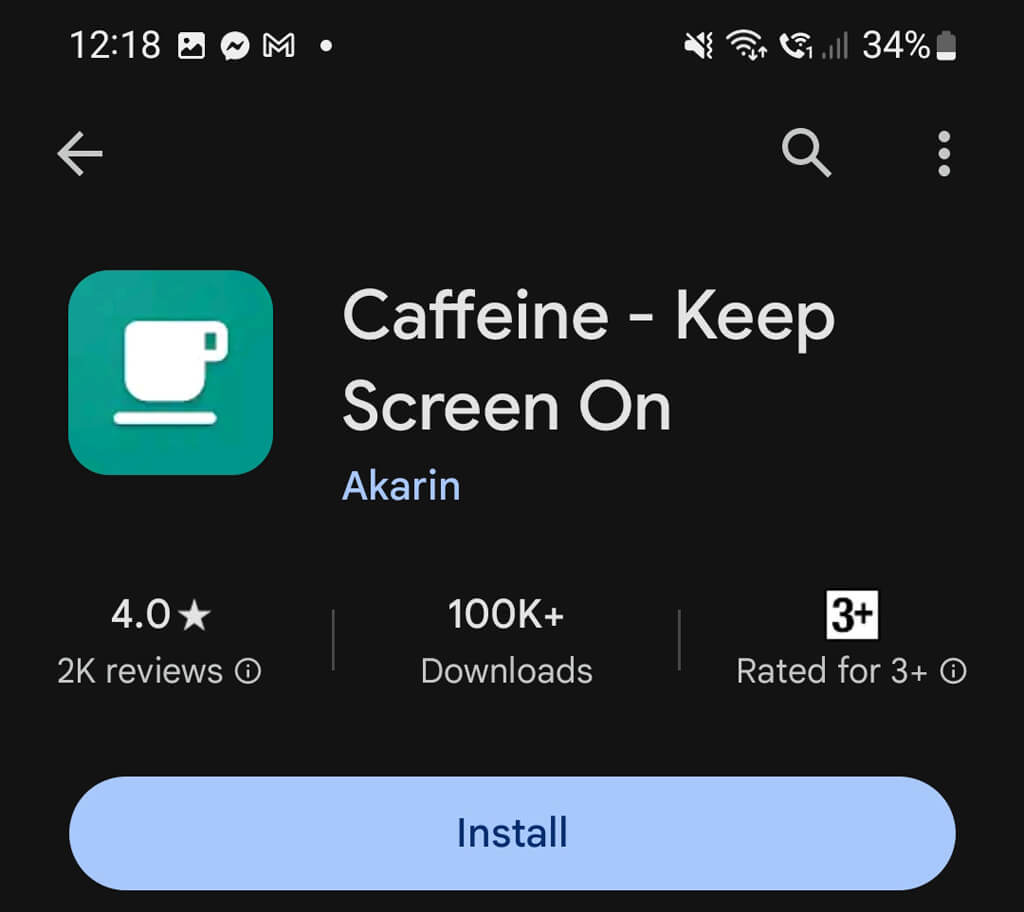 Υπάρχουν δεκάδες εφαρμογές τρίτων στο Google Play Store που υπόσχονται να κάνουν το τηλέφωνό σας να έχει πάντα στην οθόνη. Ένα από τα πιο αξιόπιστα από αυτές τις εφαρμογές καλείταιΚαφεΐνη-Διατηρώντας την οθόνη. Για λήψηΚαφεΐνη: