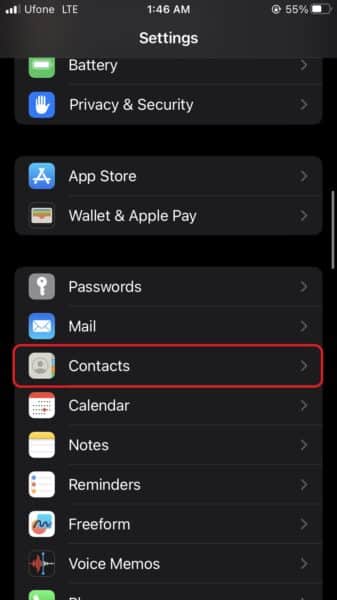 - Πρώτον, πρέπει να συνδεθείτε στο λογαριασμό σας στο Google στο iPhone σας. Ανοίξτε την εφαρμογή ρυθμίσεων στο iPhone σας και στη συνέχεια μετακινηθείτε προς τα κάτω και πατήστεΕπαφές.