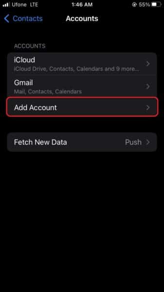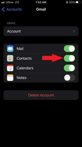- Εάν έχετε ήδη έναν λογαριασμό Gmail συγχρονισμένο στο iPhone σας, δεν χρειάζεται να προσθέσετε έναν νέο λογαριασμό για να συγχρονίσετε τις επαφές σας στο Google. Ακολουθήστε το βήμα 2 μέχρι τοΛογαριασμοίΚαρτέλα και, στη συνέχεια, πατήστε στον υπάρχοντα λογαριασμό. Στη συνέχεια, απλά μεταβείτε την εναλλαγή για επαφές στο ON.