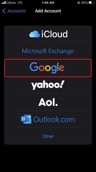 - Στη συνέχεια, πατήστεΠροσθέστε λογαριασμόκαι επιλέξτεGoogle. Ακολουθήστε τις υποδείξεις για να εισαγάγετε τα στοιχεία σύνδεσης του λογαριασμού σας στο Google.